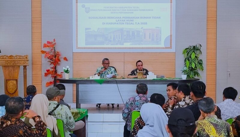 Slawi – Seusai pelaksanaan seleksi dan pembekalan Tenaga Fasilitator Lapangan (TFL). Disperkim Kabupaten Tegal gelar Sosialisasi Rencana Perbaikan Rumah Tidak Layak Huni (RTLH) dengan mengundang beberapa desa dan camat yang warganya mendapatkan bantuan Rehab RTLH, Selasa (20/05/2025).
