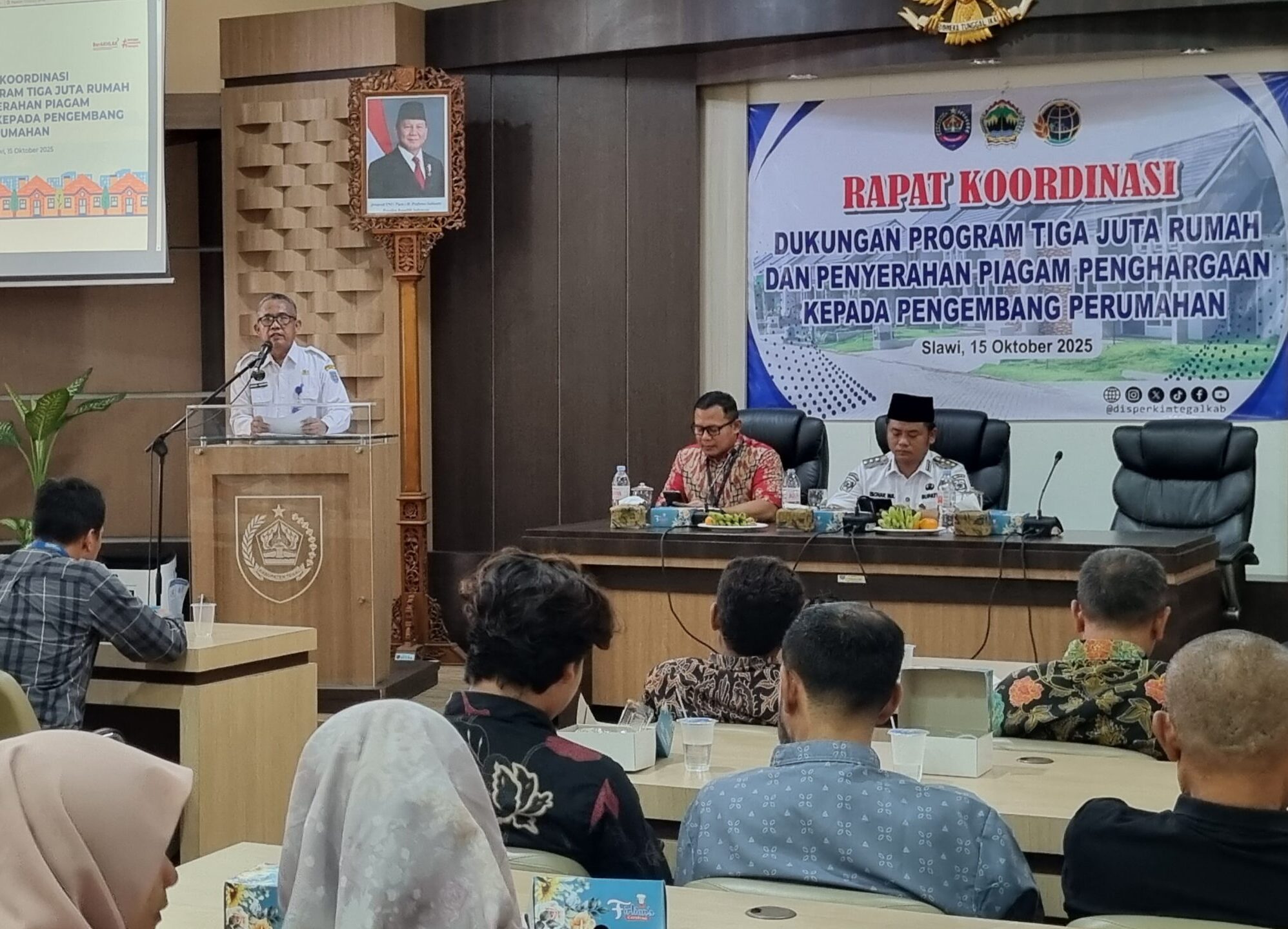 Slawi – Pemerintah Kabupaten Tegal melalui Dinas Perkim Kab. Tegal menggelar Rapat Koordinasi Dukungan Program 3 Juta Rumah dan Penyerahan Piagam Penghargaan Kepada Pengembang Perumahan yang diselenggarakan di Ruang Rapat Bupati Tegal, Rabu (15/10).